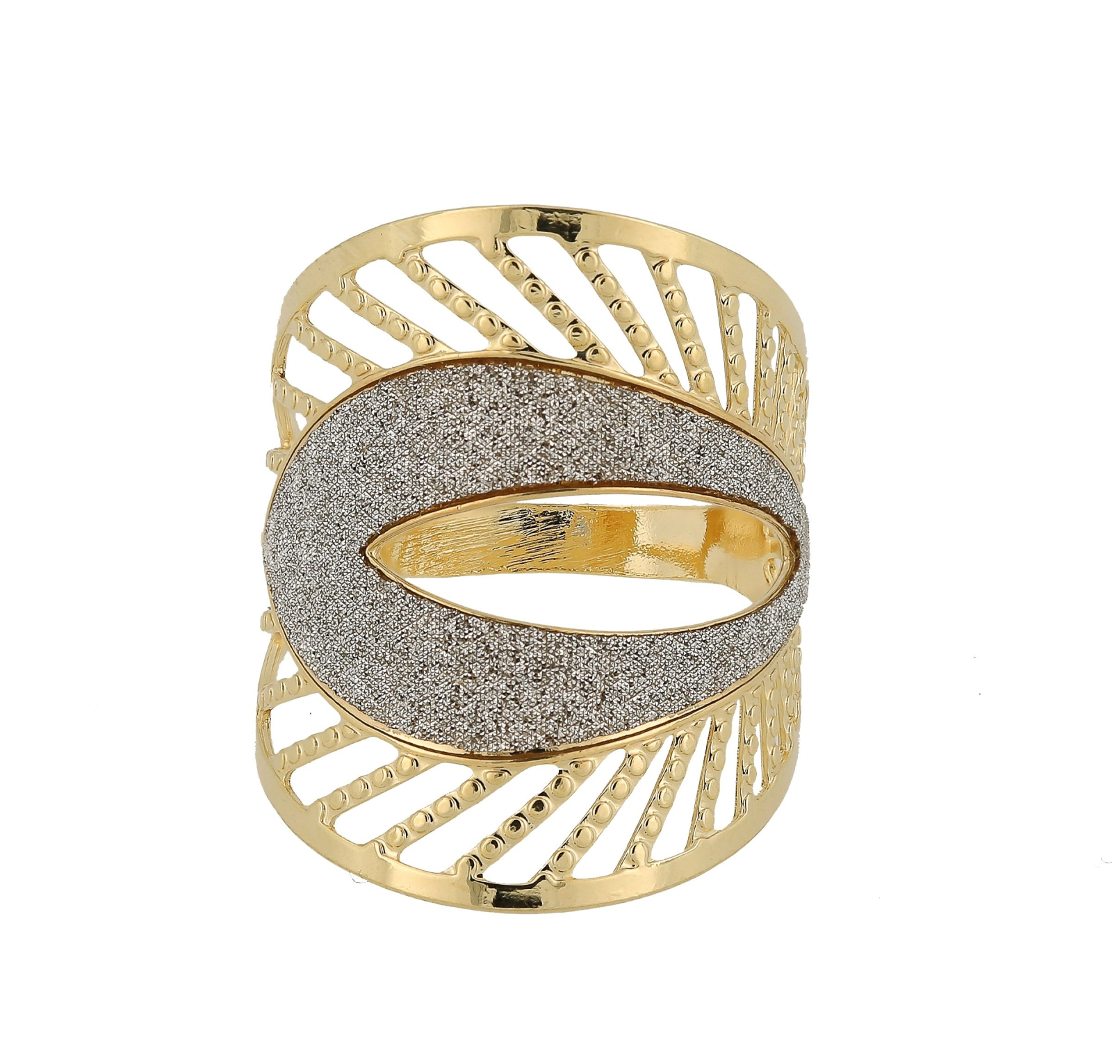 Inel placat cu aur de 18k, 2 microni productie Brazilia, cu pulbere stralucitoare gri (micropave).Latime 2,3 cm