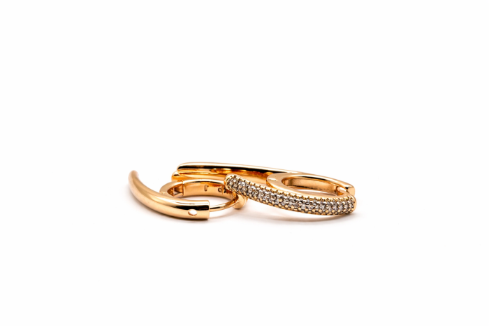 Cercei eleganți placați cu aur, tip cerc, cu design modern și detalii fine decorative. Un accesoriu versatil, potrivit atât pentru ținutele de zi, cât și pentru cele de seară, adăugând un plus subtil de strălucire și stil.