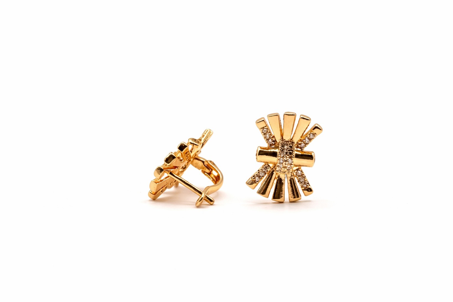 Cercei placați cu aur, cu design modern tip evantai și detalii decorative fine. Un accesoriu elegant și distinct, ideal pentru a completa ținutele cu un plus de stil și originalitate.