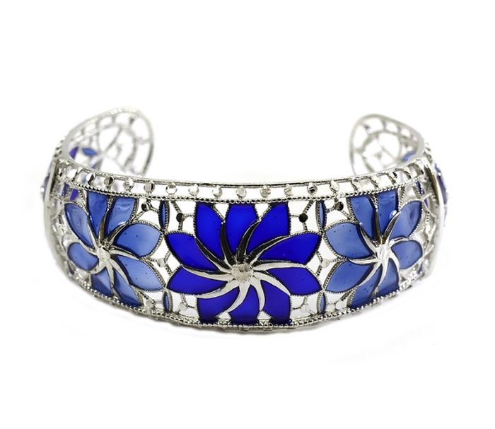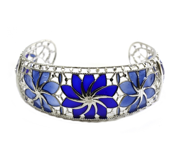 Bratara argint 925 rodiat cu 5 flori din email albastru, design italian, greutate 21,3 g , lungime bratara 17 cm, latime bratara 3 cm.