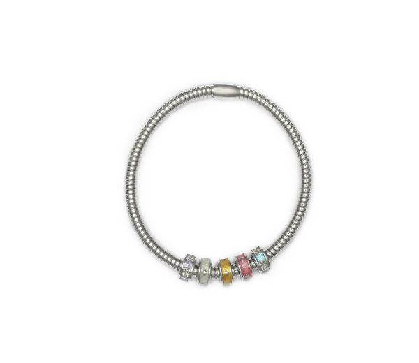Bratara argint 925 rodiat, model Pandora cu 5 cerculete sidefate si pietre zirconia albe ( modelul elastic, permite intindere). Culori: alb, galben, greutate 11 g , lungime reglabil de la 17,5 cm.