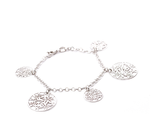 Bratara argint rodiat 925, design italian, cu medalioane frorale 2, 3 cm si 1, 5 cm , greutate 5,5 g , lungime 18,5 cm.