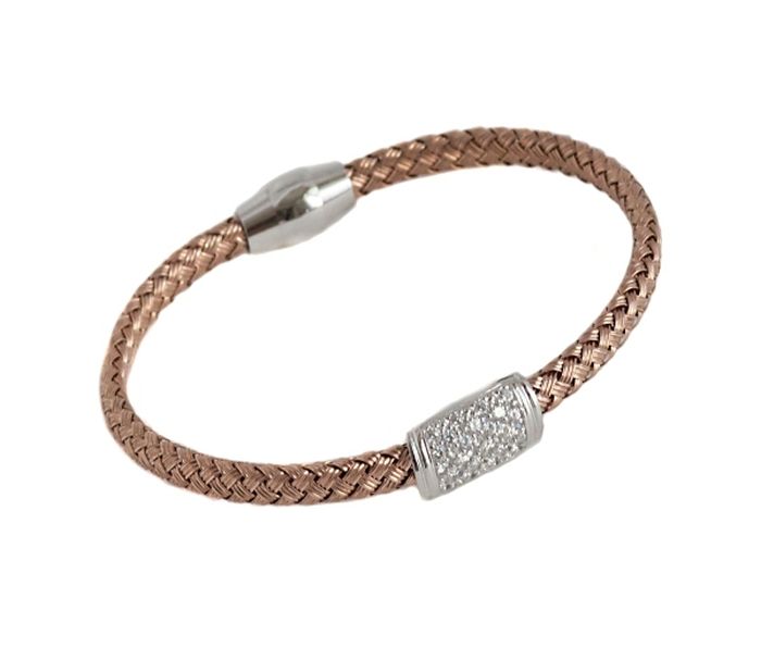 Bratara argint 925 placat cu rodiu roz, cu o placuta alba cu zirconia albe stralucitoare. Inchidere cu magnet. Greutate 8.2 g, lungime 18.5 cm, latime 0.5 cm