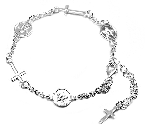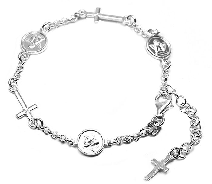 Bratara argint 925, productie Italia, greutate 4 g , cu trei pandante ingerasi (diametru - 0,8 cm) si trei cruciulite ( lungime 1 cm ), reglabila 16,5 cm - 19,5 cm,
