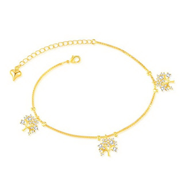 Bratara pentru picior, placata cu aur de 18 k, cu pietre zirconia , cu trei pandantive mode Pomul Vietii , latime pandant 1,3 cm , lungime bratara 21 cm - 27 cm