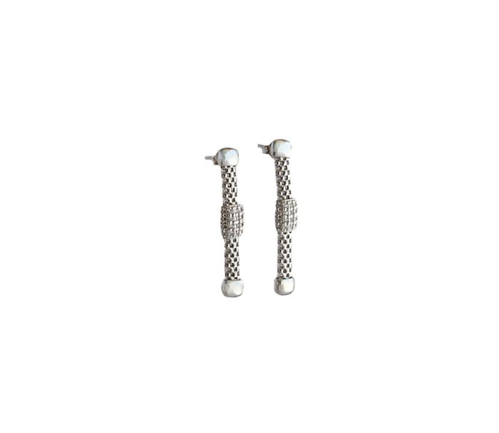 Cercei argint 925 rodiat, design italian, cu o placuta ornata cu zirconia albe stralucitoare. Inchidere cu surub. Greutate 4.6 g, lungime 3.5 cm, latime 0.5 cm