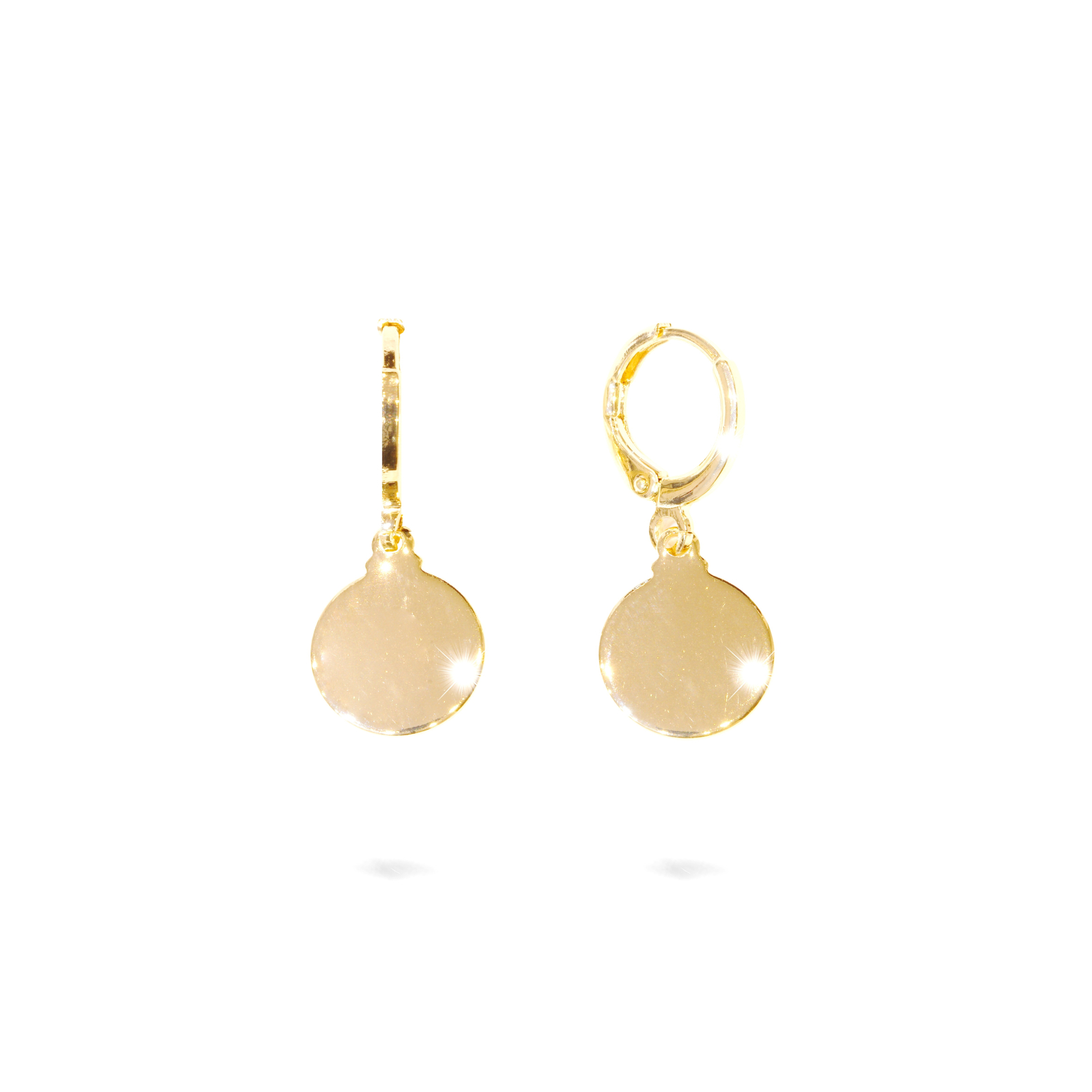 Cercei placati cu aur de 18 k, productie Brazilia, model banutul norocos, latime banut 1 cm, diametru cerc inchidere 1 cm