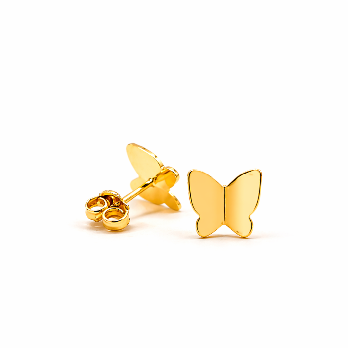 Cercei placați cu aur, în formă de fluture, cu design delicat și finisaj lucios. Un model feminin și jucăuș, ideal pentru a adăuga un plus de eleganță și rafinament ținutelor de zi cu zi.