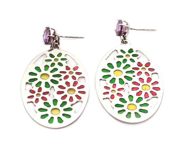 Cercei argint 925, rodiat, design italian, cu ametist (0. 5 cm ), model floral/ Culori: rosu, verde, galben. Greutatea 6.8 g, lungime 5.5 cm, latime 2.5cm
