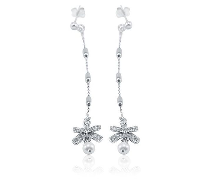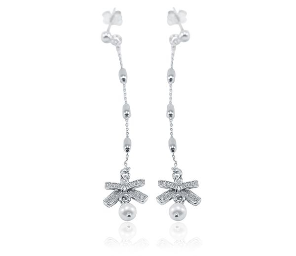 Cercei argint 925 rodiat, design italian, pandant fundita cu perla swarovski si pietre zirconia, greutate 3,6 g , lungime 8 cm.