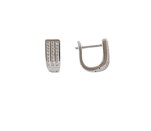 Cercei argint 925, placat cu rodiu, design italian, cu trei randuri cu zirconia micropave - albe. Greutate 3.8 g, lungime 1.4 cm , latime 0.6 cm
