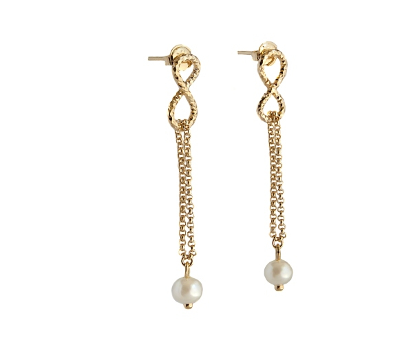 Cercei placati cu aur de 18k, 2 microni, productie de lux Brazilia, model "infinit" cu un lantisor dublu si o perla de 0. 5 cm. Inchidere cu surub, lungime 5 cm