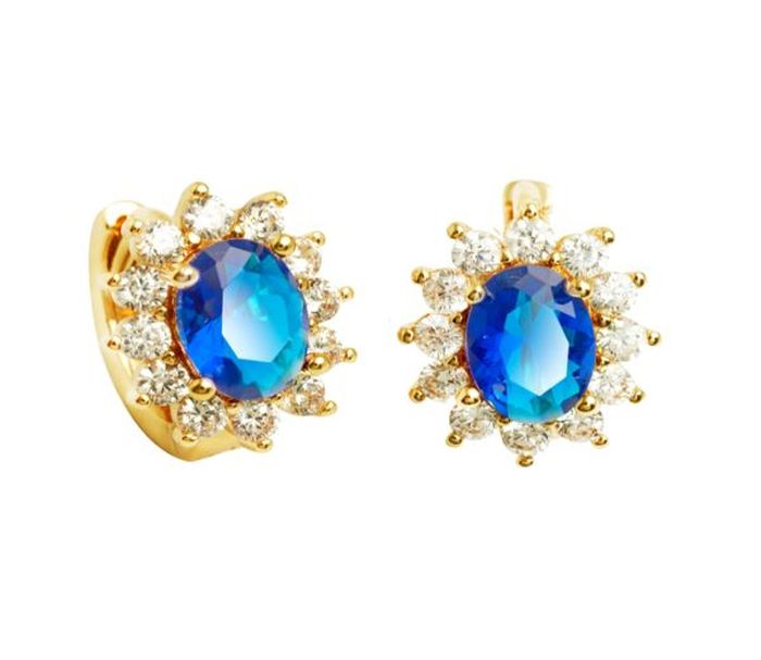 Cercei placati cu aur de 18k, 2 microni cu o piatra zirconia albastru (safir) de 0. 7/0. 4 cm si cubic zirconia albe pe margine. Inchidere clasica pe ureche, lungime 1 cm