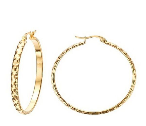 Cercei placati cu aur de 18k, 2 microni, creola cu model in relief, latime 0,3 cm, diametru 4 cm