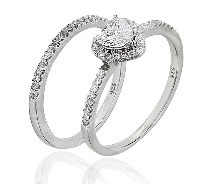 Inel de logodna argint 925 rodiat, design italian format din 2 inele cu pietre zirconia albe si o piatra inima de 0. 5 cm . Greutate 3 g