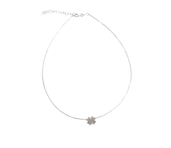 Colier argint 925, placat cu rodiu, design italian model semifix cu un trifoi impodobit cu pietre zirconia albe, montura micropave. Greutate 9.5 g, lungime 42 + 5 cm