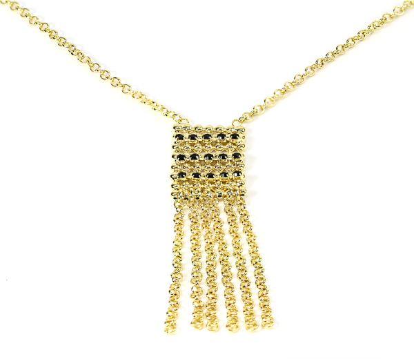 Colier placat cu aur de 18k, 2 microni, lungime 42 cm cu extensie 5 cm, latime 0.3 cm,productia de lux Brazilia, cu un pandantiv de7 cm/1, 5 cm cu pietre, onix negru.