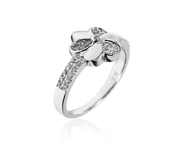 Inel argint 925 rodiat, design italian, model floral presarat cu pietre zirconia stralucitoare. Latime 1 cm, greutate 3,4 g
