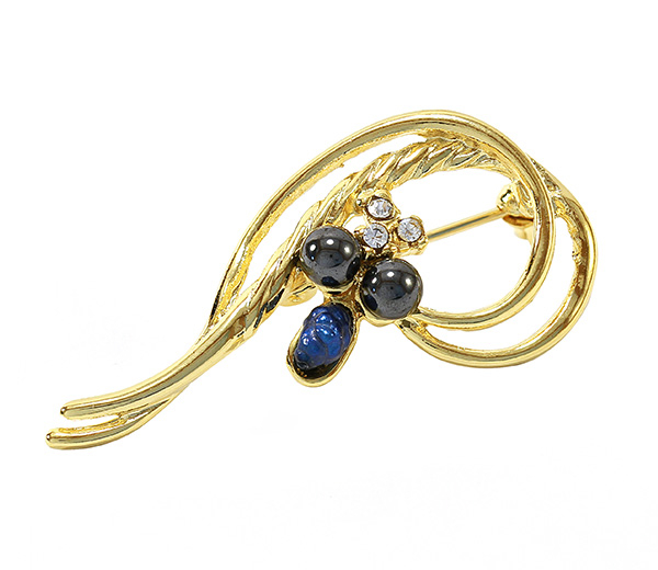Brosa placata cu aur de 18k cu 2 hematite si o perla de cultura, 3 pietre zirconia albe, lungime 4.2 cm