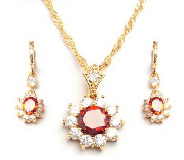 Set placat cu aur de 18 K, 2 microni, format din lant cu lungimea 45 cm plus pandantiv diametru de 1. 5 cm si Cercei lungime 1 cm + 2 cm, cu pietre zirconia rosii si albe