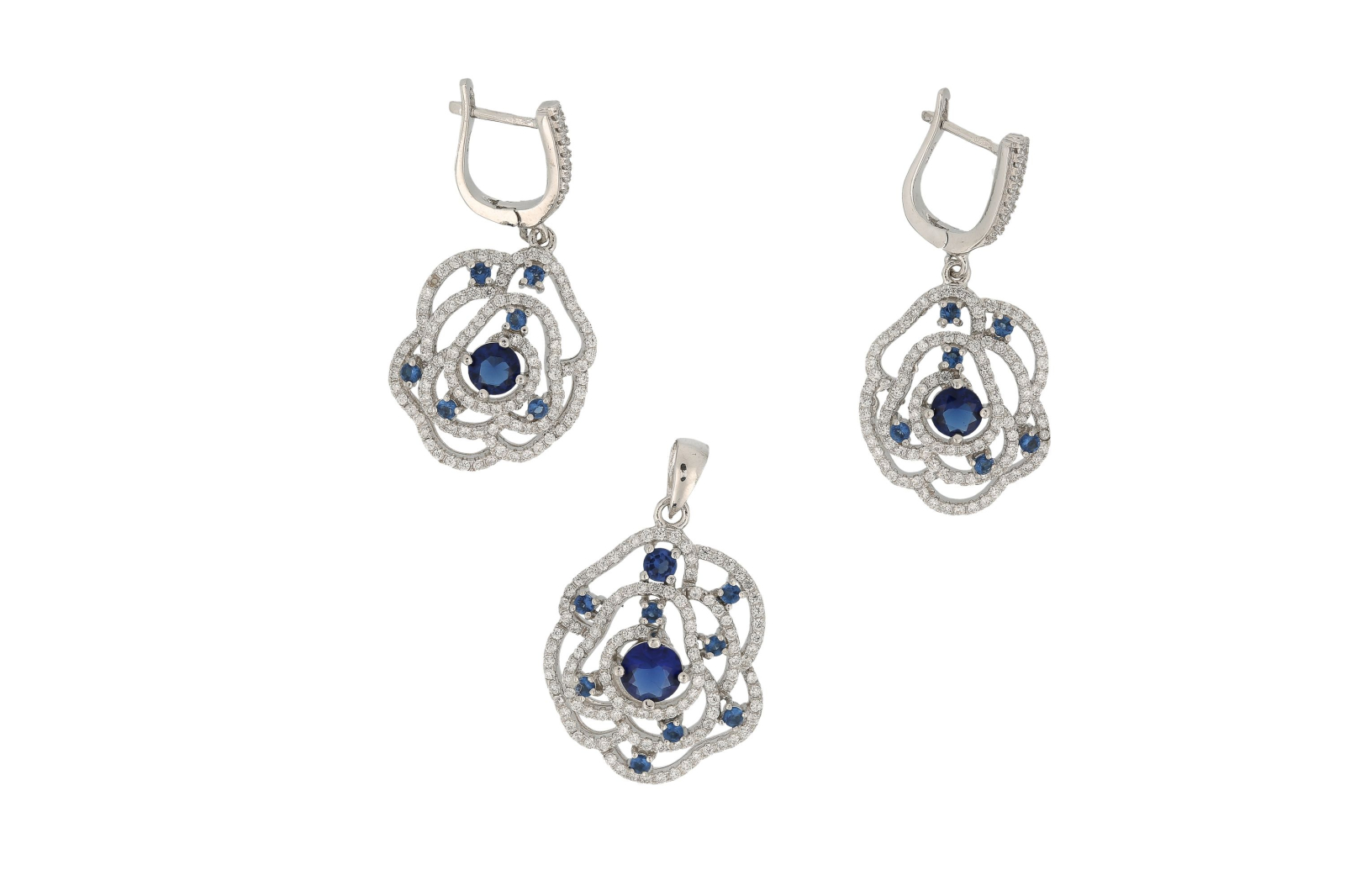 Set argint 925 rodiat, design italian: cercei, pandantiv. Pietre: zirconia. Culori: alb, albastru., greutate 18 g, lungime cercei: 3.7 cm, pandantiv: 3.4 cm , latime 2 cm