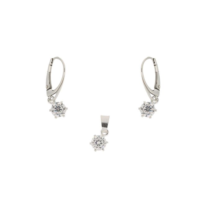 Set argint 925, rodiat, cu o piatra zirconia alba (0,6 cm) , lungime cercei 2,5 cm, lungime pandantiv 0,6 + 0,7 cm, greutate 3,9 g,