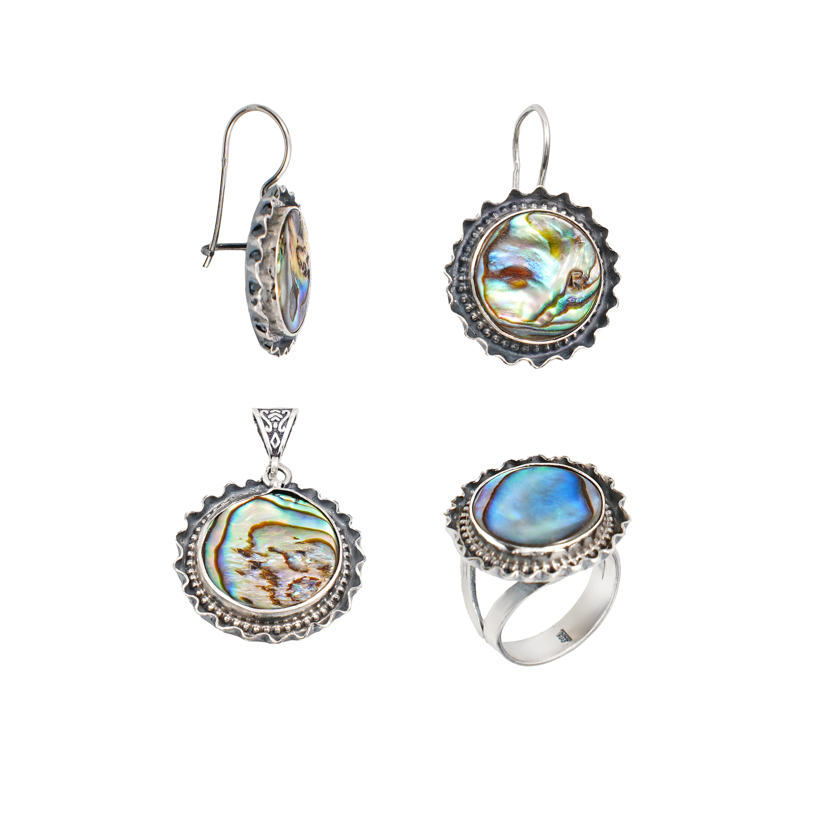 Set argint 925, scoica abalone , inel : marime 56 / 59; diametru 2.2 cm ; cercei : L -2.6 cm ; l -2.2 cm ; pandant : L -3.5 cm ; l -2.4 cm : gr.19.57