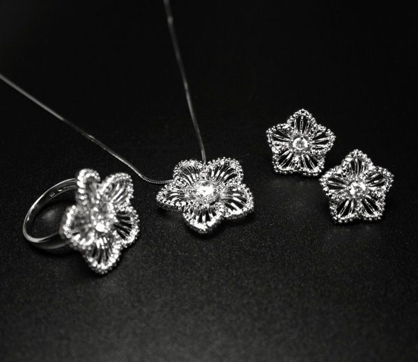 Set pentru mirese, argint 925 rodiat: cercei, lant, pandantiv, design italian. Pietre: zirconia. Culori: alb. Lungime lant 45 cm, diametru pandantiv 2,5 cm, cercei 2 cm, inel 2,5 cm, greutate 26,8 g, marime inel 58 .