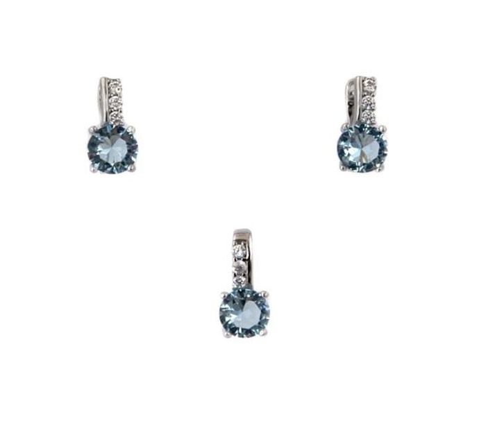 Set argint 925 rodiat, design italian, format din cercei si pandantiv cu pietre zirconia albe si albastru-aquamarin . Cercei cu inchidere clasica pe ureche. Lungime 1,5 cm, latime 0,7 cm, greutate 4,3 g